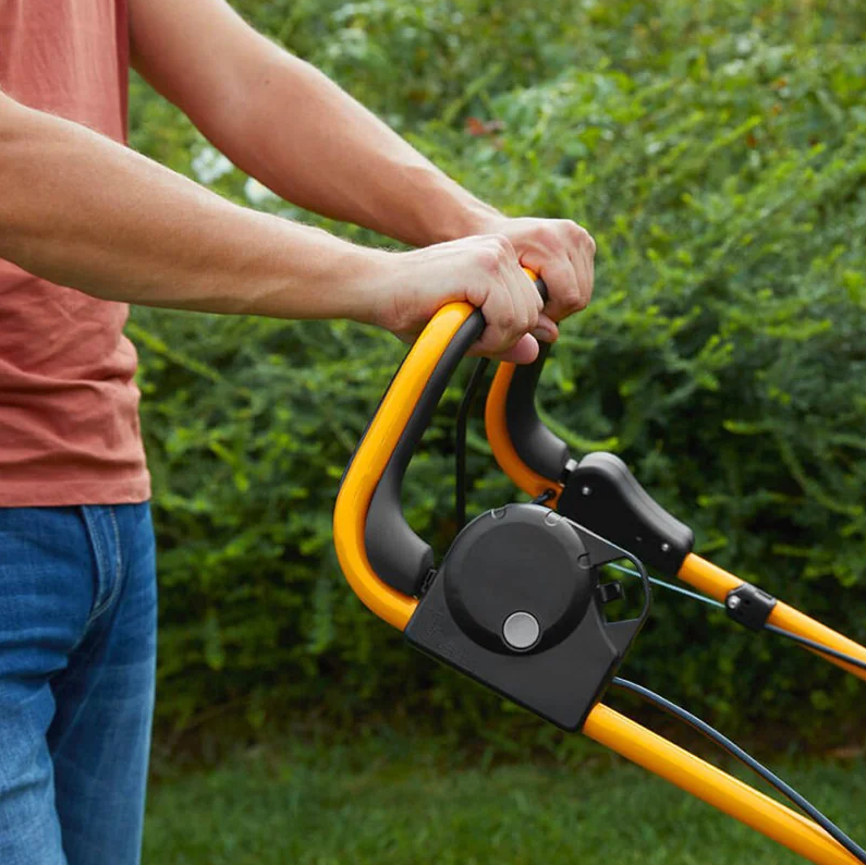 Kosiarka została zaprojektowana z myślą o wygodzie użytkownika. Regulowana i składana kierownica pozwala dopasować pozycję pracy do wzrostu operatora oraz ułatwia przechowywanie urządzenia. Dodatkowy przedni uchwyt transportowy umożliwia łatwe przenoszenie kosiarki, a przedni zderzak ochronny zabezpiecza obudowę przed uszkodzeniami podczas pracy w ogrodzie.